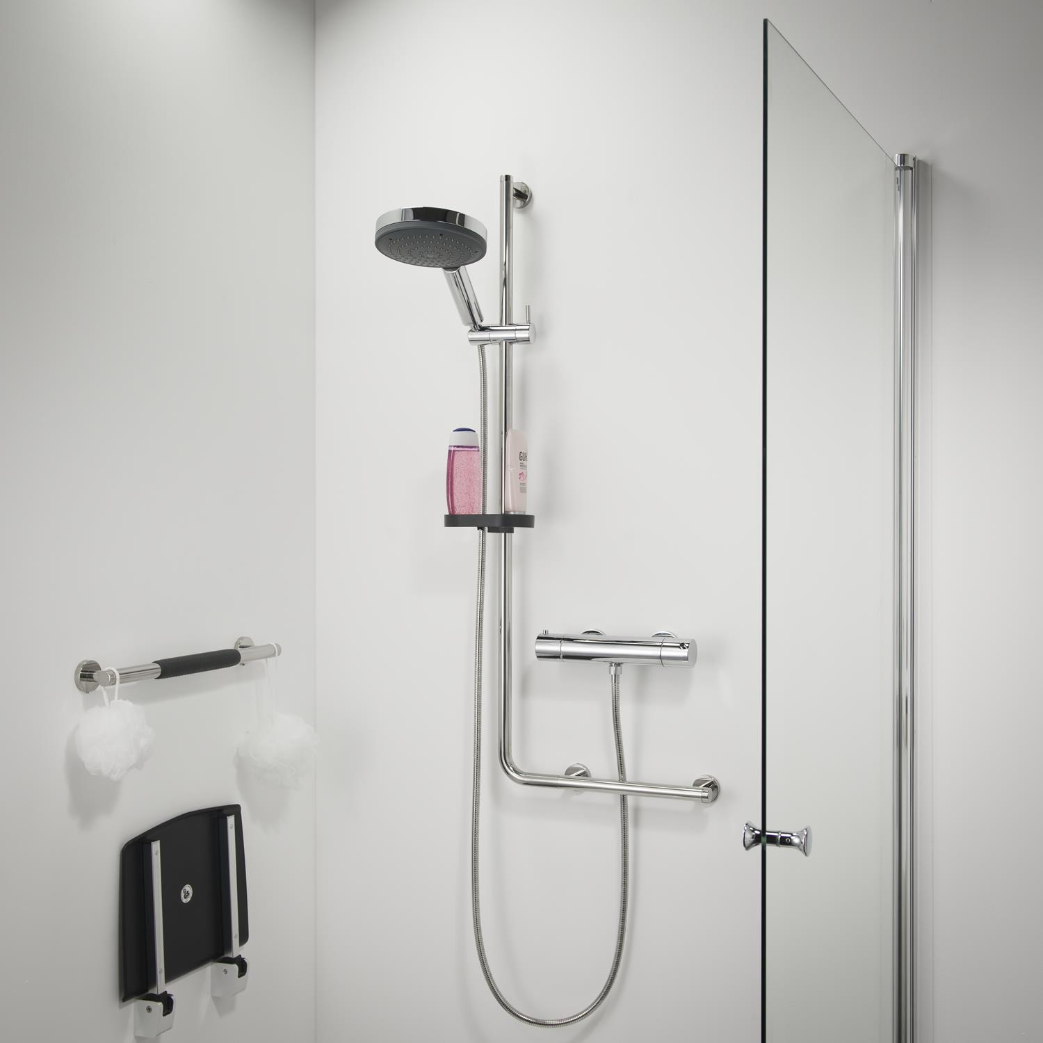 De Tiger wandbeugel met glijstang uit de serie Boston Comfort en Safety is uitgevoerd in de kleur chroom. De Tiger Boston Comfort en Safety wandbeugel met glijstang biedt extra ondersteuning en comfort tijdens het douchen. De ergonomische veiligheidsgreep heeft een diameter van 25 mm. De Tiger Boston Comfort & Safety wandbeugel met glijstang heeft een maximale belastbaarheid van 150 kg. Het glij-mechanisme is zeer gemakkelijk te verstellen in hoogte en hoek. Daarnaast kan er een extra antislip grip op de veiligheidsgreep gemonteerd worden, deze is apart verkrijgbaar. Dit geldt ook voor de organizer.
