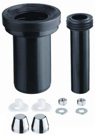Wandcloset aansluitset 90-110 180mm bestaande uit: -Verlengpijp 110-90, lengte 180mm inclusief manchet -Verlengpijp 55mm met rubber manchet lengte 180mm -2 stuks ringen -2 stuks M12 moeren -2 stuks chroom afdekkappen