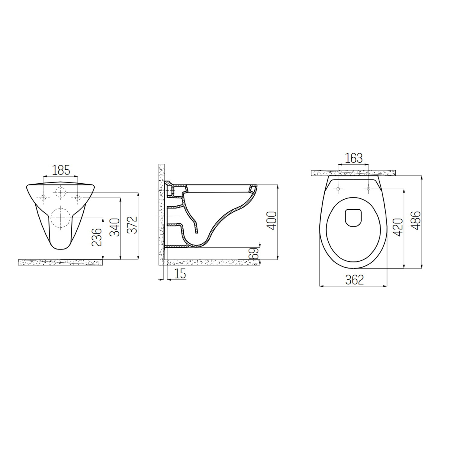 De diepspoelwandcloset heeft een diepte van 48,6 cm, een breedte van 36,2 cm en een hoogte van 40 cm.