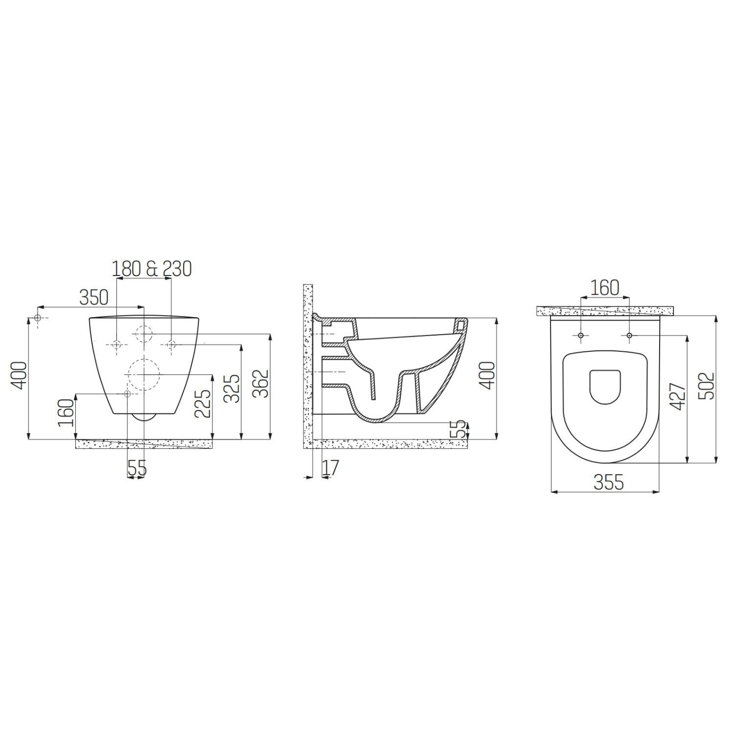 De diepspoel wandcloset is 50cm diep en 35.5cm breed. De hart op hart maat voor de bevestiging van de bril is 16cm. De ophangbevestiging is zowel voor 18 en 23 cm (hoh) Dat maakt het mogelijk om de zitting op meerdere reservoirs te hangen.