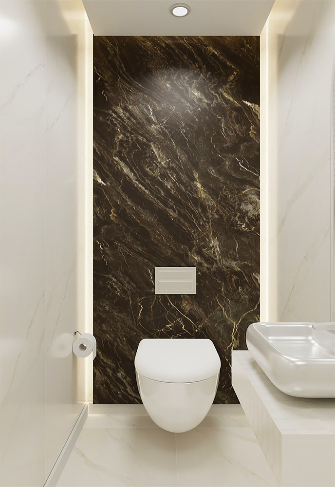 Waterdicht en bestand tegen vocht, kunnen deze panelen direct over bestaande tegels worden aangebracht, waardoor ze een snelle en efficiënte manier bieden om elke ruimte te transformeren. Of het nu gaat om een badkamer, toilet, keukenachterwand of zelfs gangen, onze PVC panelen voegen een vleugje elegantie toe zonder de kosten van traditionele marmeren tegels.