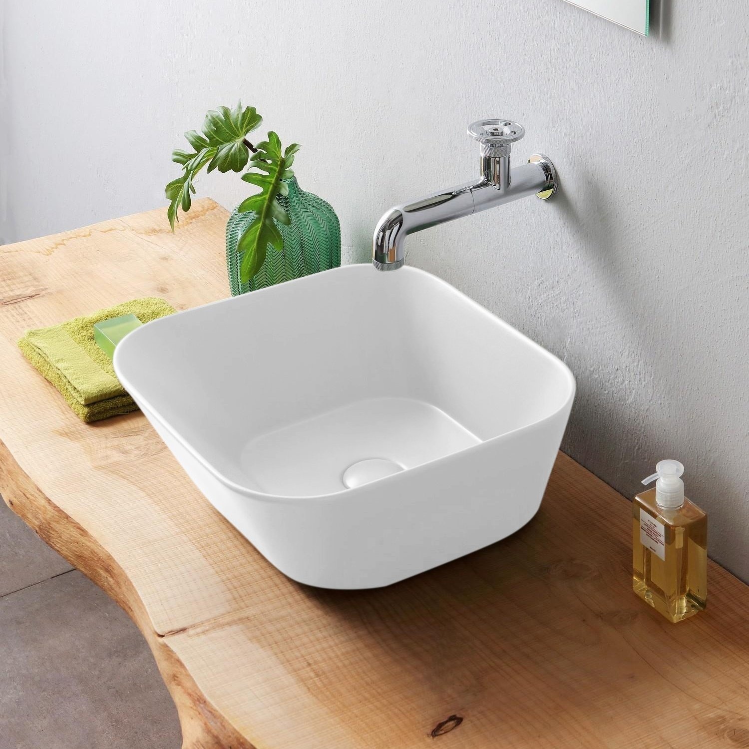 Deze Mees Design opbouw waskom zorgt met zijn fraaie mat witte uitstraling en unieke vorm een moderne look in uw badkamer. Zeker als u de waskom combineert met andere mat witte items in uw badkamer. De waskom kent een breedte van 42 cm, diepte van 42 cm en heeft een hoogte van 16.5 cm.
