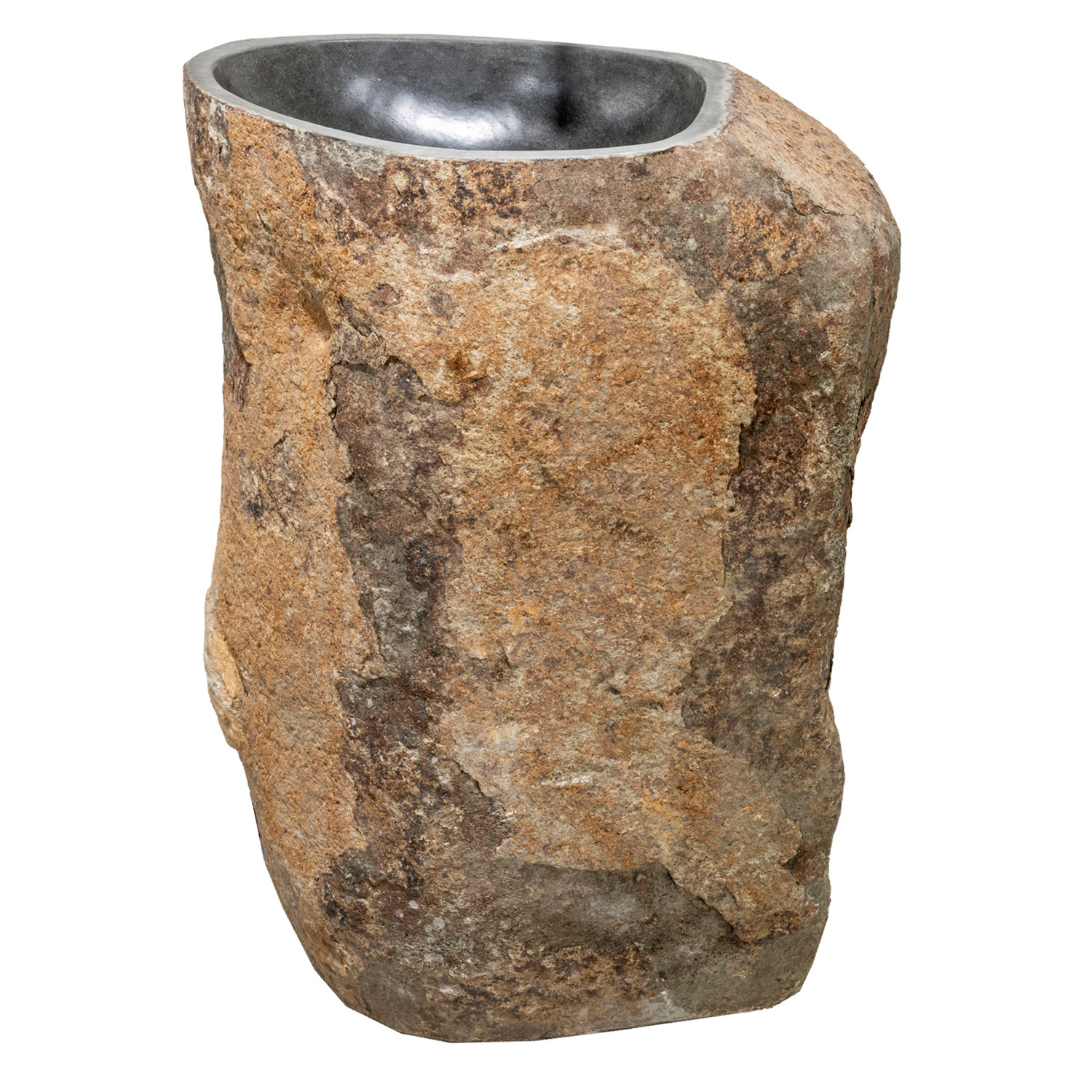 Deze van River Stone gemaakte waskom op een voetstuk is van het merk Cipi. Hij komt ui de serie Joya en heeft altijd unieke afmetingen die variëren tussen de 45 tot 55 cm breed met een hoogte die varieert van 80 tot 85 cm. De waskom is met de hand uitgehakt en heeft een opening aan de achterkant om het leidingwerk langs te laten lopen. Elke waskom is uniek omdat dit een natuurlijk product is.