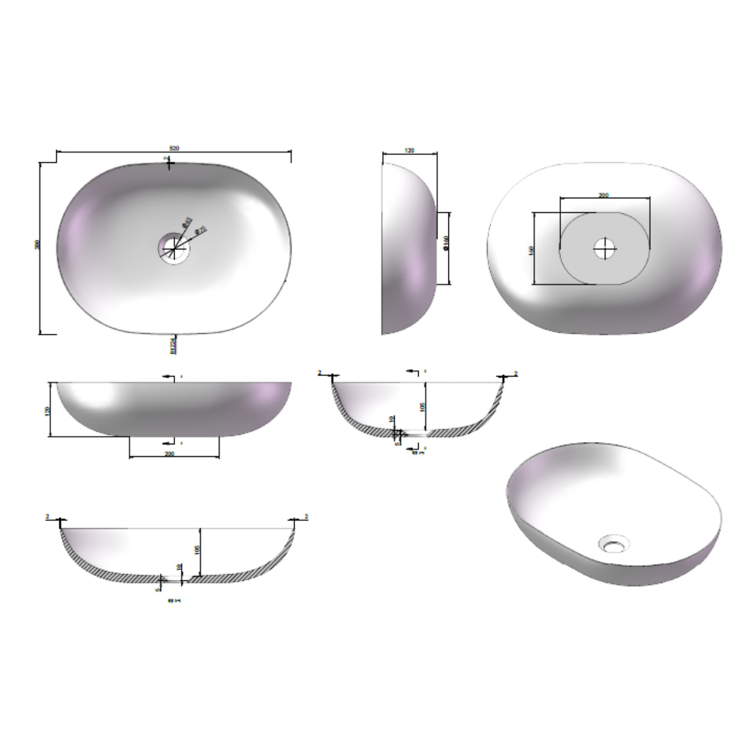 De waskom heeft een hoogte van 12 centimeter en is 52 centimeter breed. De kom is gemaakt van solid surface. Dit bijzondere materiaal is een composiet van mineralen en harsen. Het materiaal is niet poreus en bovendien zeer hygiënisch.