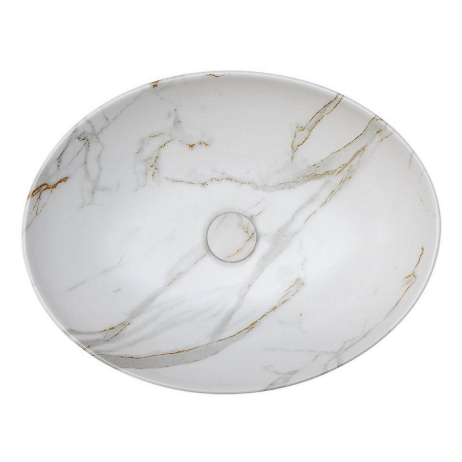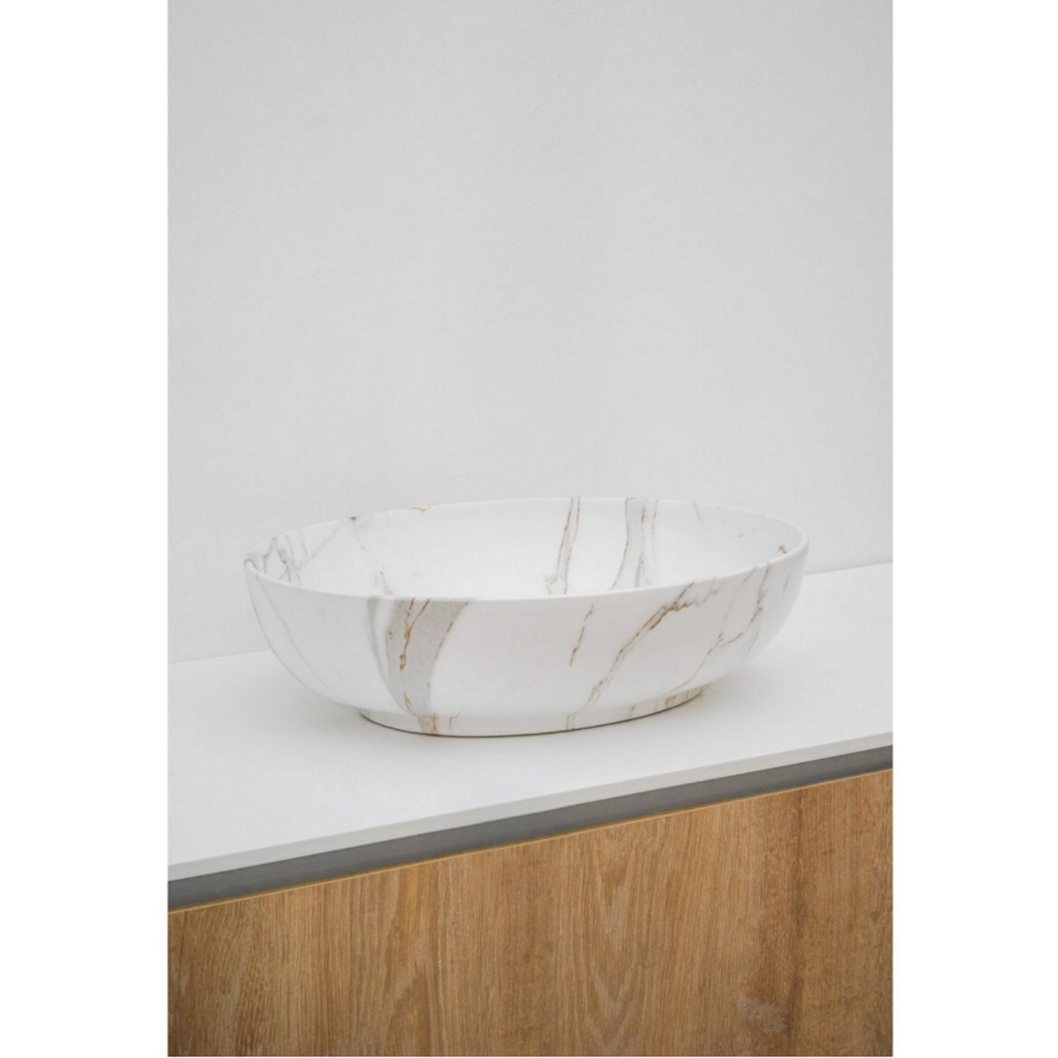 Deze waskom van het merk Riho, heeft een prachtige marmerlook! De kom is gemaakt van keramiek in een mat witte kleur. De waskom heeft een afmeting van; 52cm breed, 39.5 cm diep en 13 cm hoog. De kom is niet voorzien van een overloop en heeft ook geen kraangaten. Bij het bestellen van deze waskom wordt er een afvoerplug in bijpassende print meegeleverd. Het marmereffect komt mooi tot zijn recht doordat het op een hoge temperatuur is afgebakken.