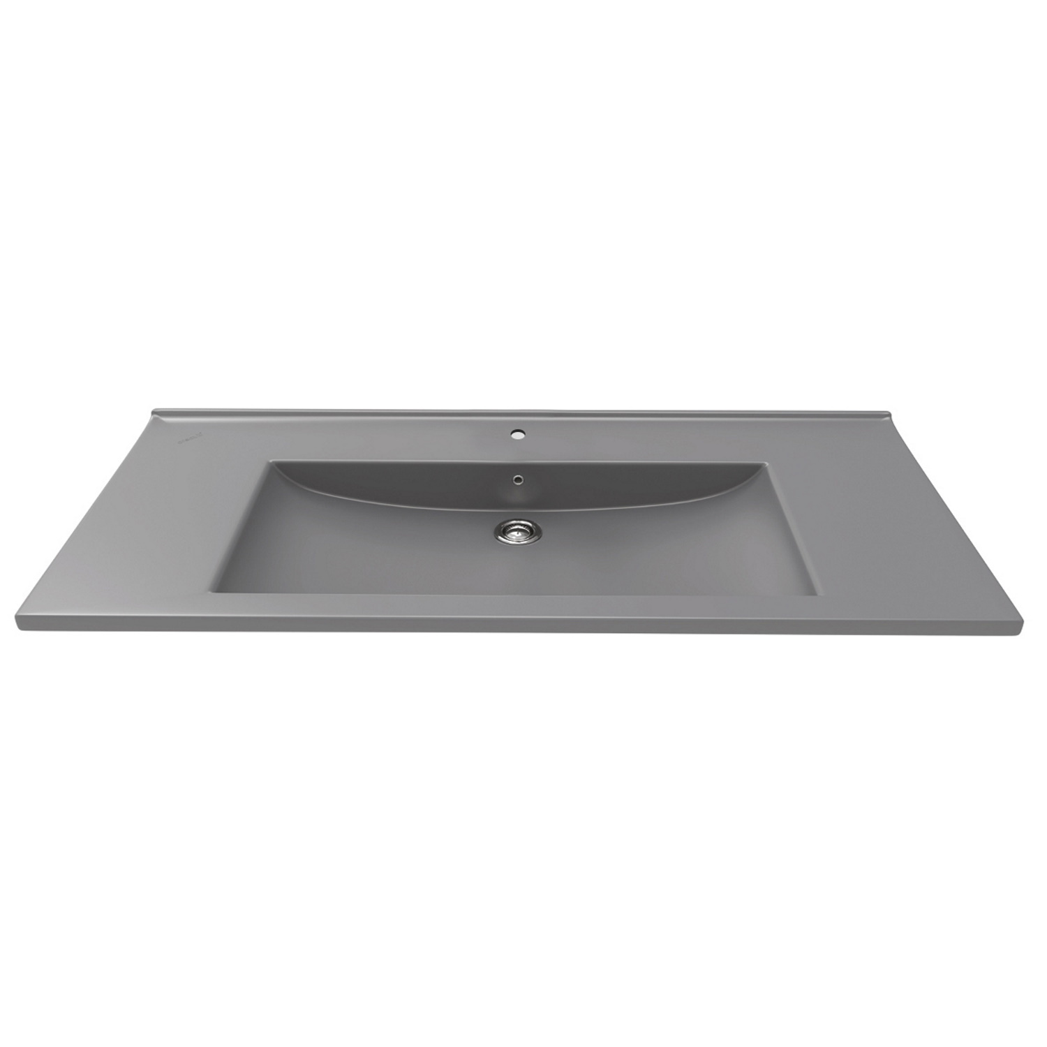 Deze wastafel is geproduceerd in de kleur antraciet en heeft een rechthoekige vorm. De diepte van deze wastafel bedraagt 45 cm cm en de breedte 100 cm. In het midden van dit artikel bevindt zich een rechthoekige wasbak.