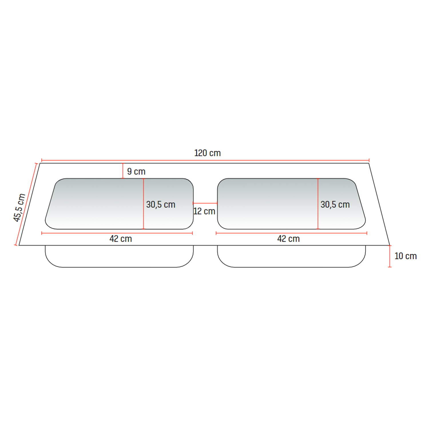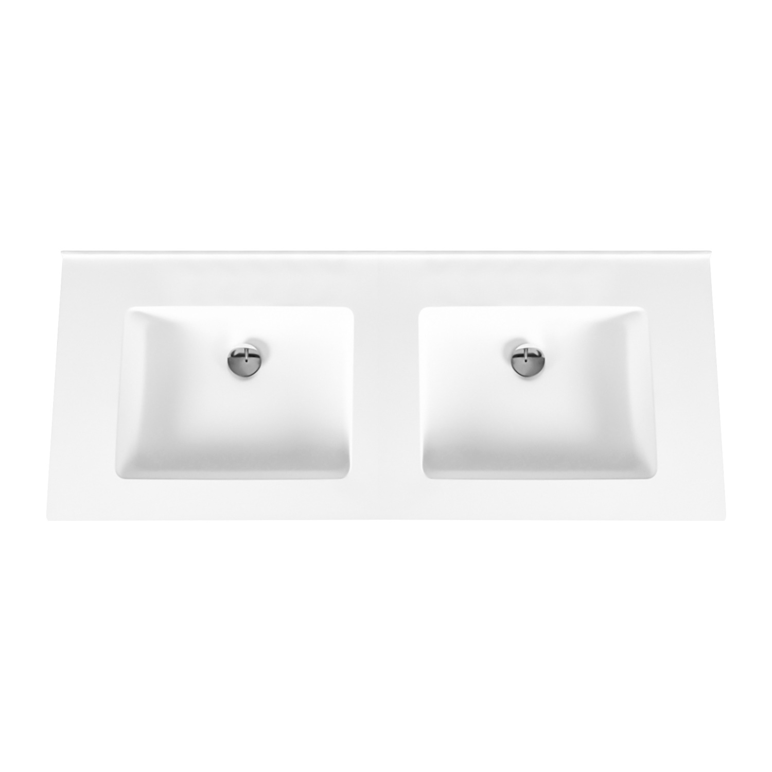 Deze wastafel is geproduceerd in de kleur wit en heeft een rechthoekige vorm. De diepte van deze wastafel bedraagt 45.5 cm cm en de breedte 120 cm. In het midden van dit artikel bevinden zich twee rechthoekige wasbakken.