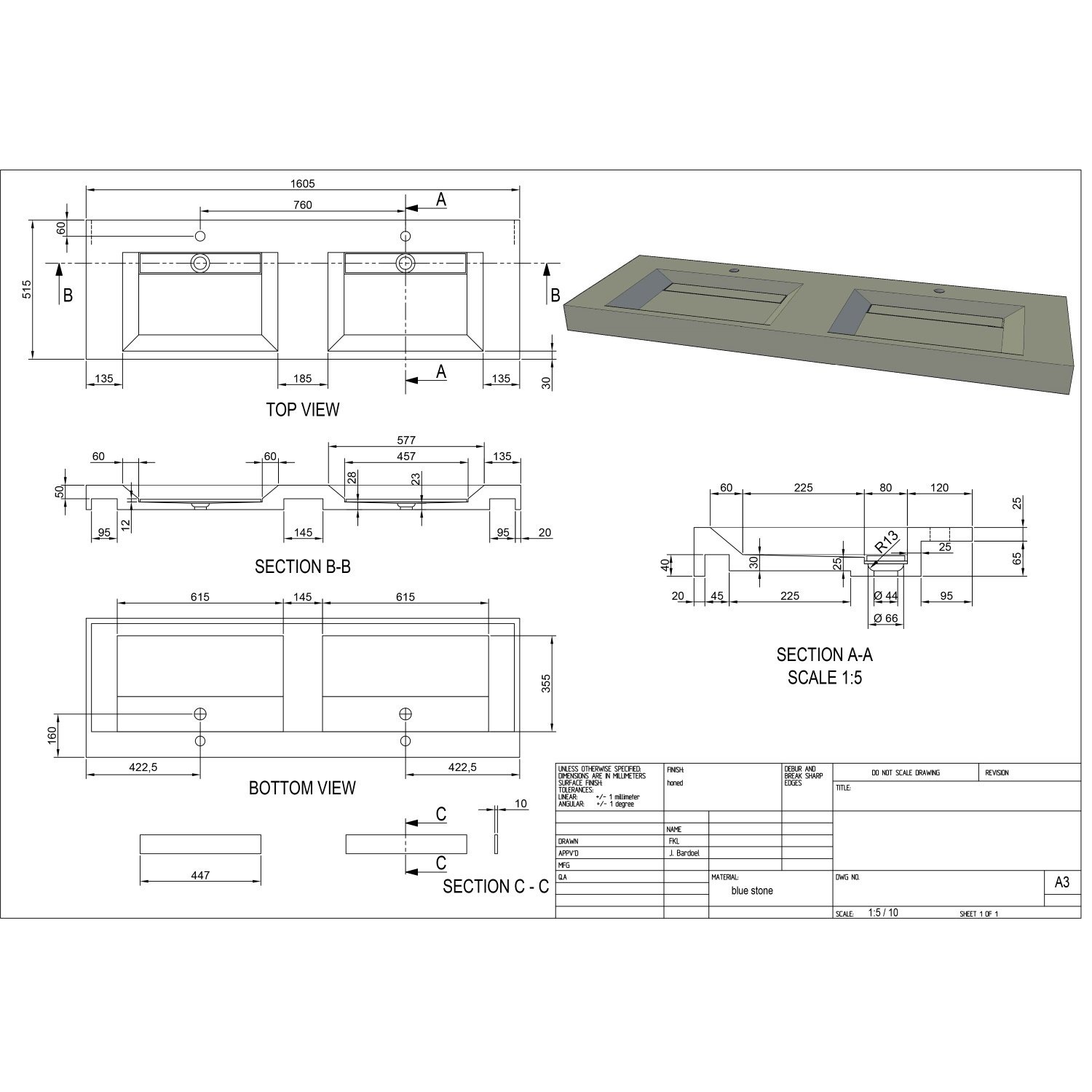 De wastafel wordt geleverd zonder kraangat waardoor u een inbouw kraan toe kunt voegen, en heeft een afmeting van 160,5x51,5x9 cm. Waarbij de breedte 160,5 cm is, de diepte 51 cm en de hoogte 9 cm. Een inbouwkraan wordt in de muur geplaatst wat zowel ruimte als een chique uiterlijk oplevert. Daarnaast heeft het afvoergat van de wastafel een diameter van 44 mm.