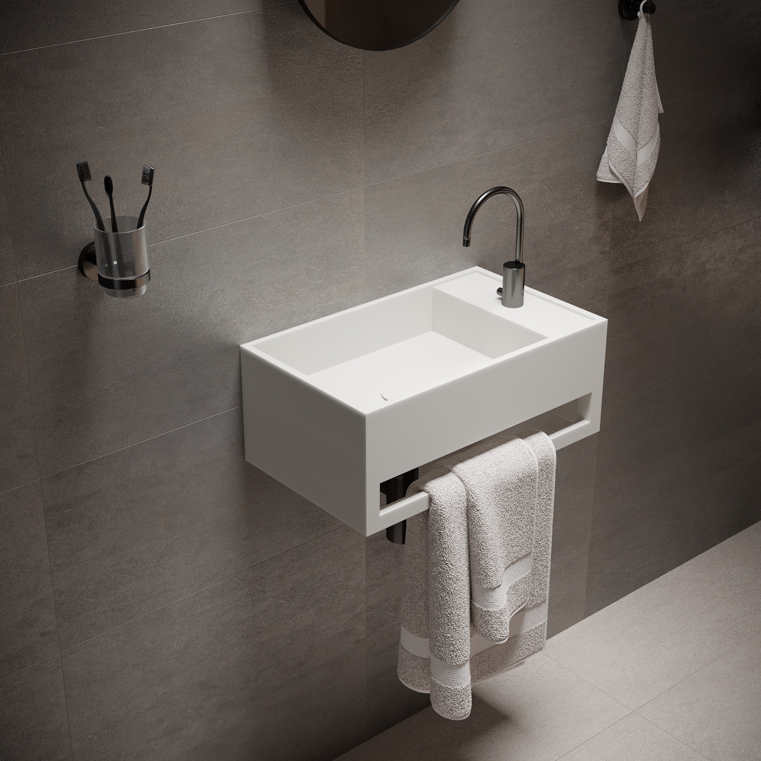 Solid Surface is uitstekend geschikt om sanitaire producten van te maken omdat het geen poriën en naden heeft. Solid Surface is een composiet, geproduceerd uit mineralen en harsen. Bovendien is dit materiaal bestendig tegen vocht, vlekken, en zelfs chemische stoffen. Er trekt dus niets in, is niet poreus en heeft een intense kleur en is gemakkelijk schoon te houden. Omdat het door en door van hetzelfde materiaal bestaat, kunnen eventuele beschadigingen weg gepolijst worden. Perfect om de hygiëne te behouden in uw design badkamer of toilet.