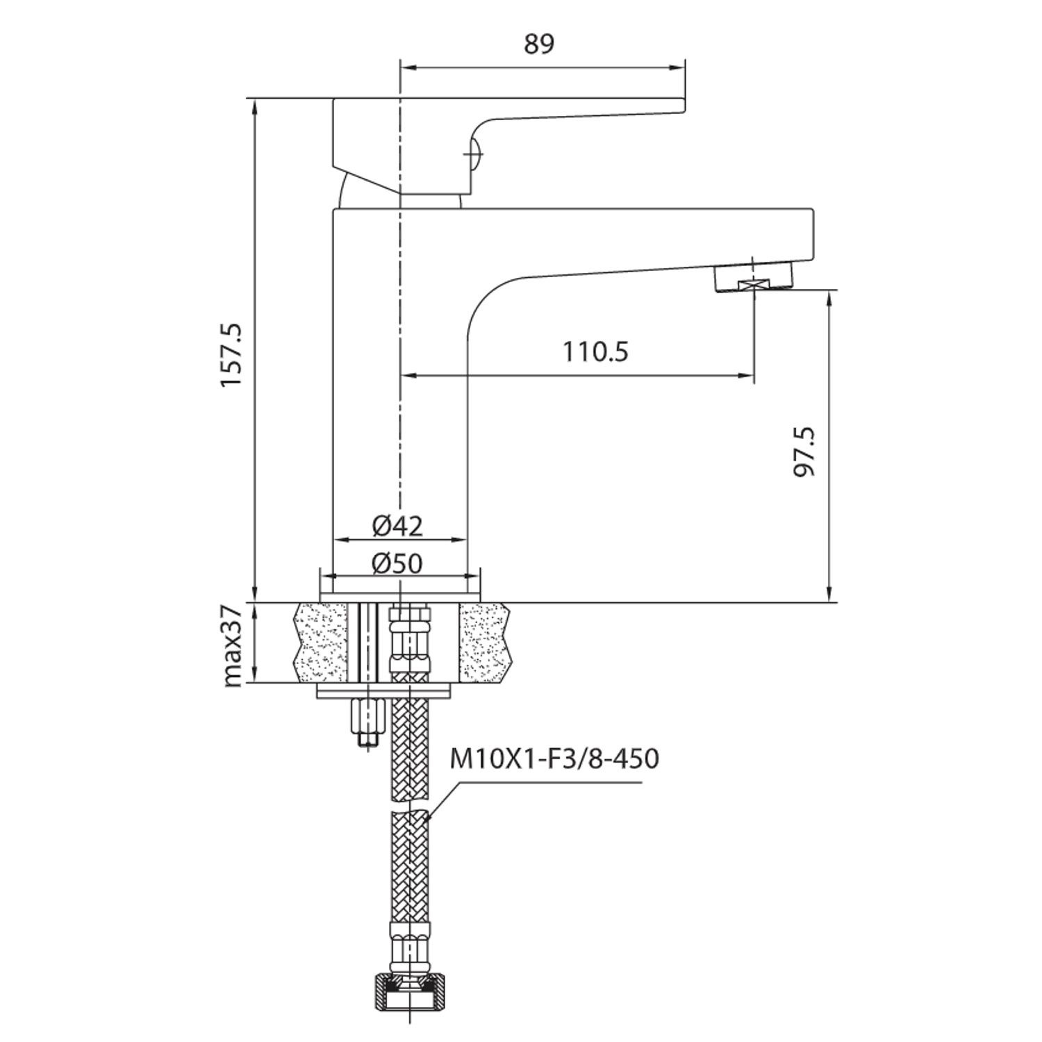 Vanaf de wastafel is de kraan 15.75 cm hoog. De uitloop is 11.05 cm lang. De hendel is 8.9 cm lang.