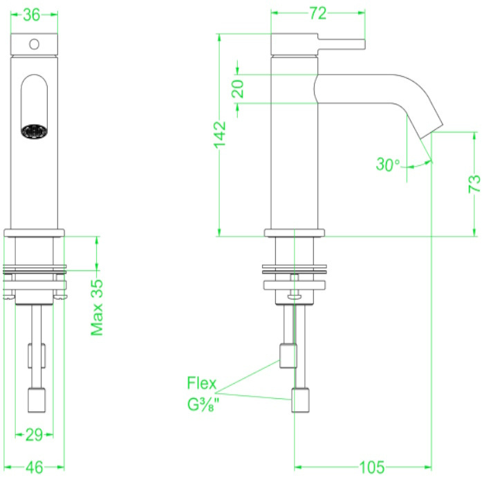 De wastafelkraan heeft een hoogte van 14,2 cm, heeft een hoogte uitloop 7,3 cm, heeft een diepte uitloop 10,5 cm, heeft draadaansluiting van (inch) 3/8 en is een mengkraan.
