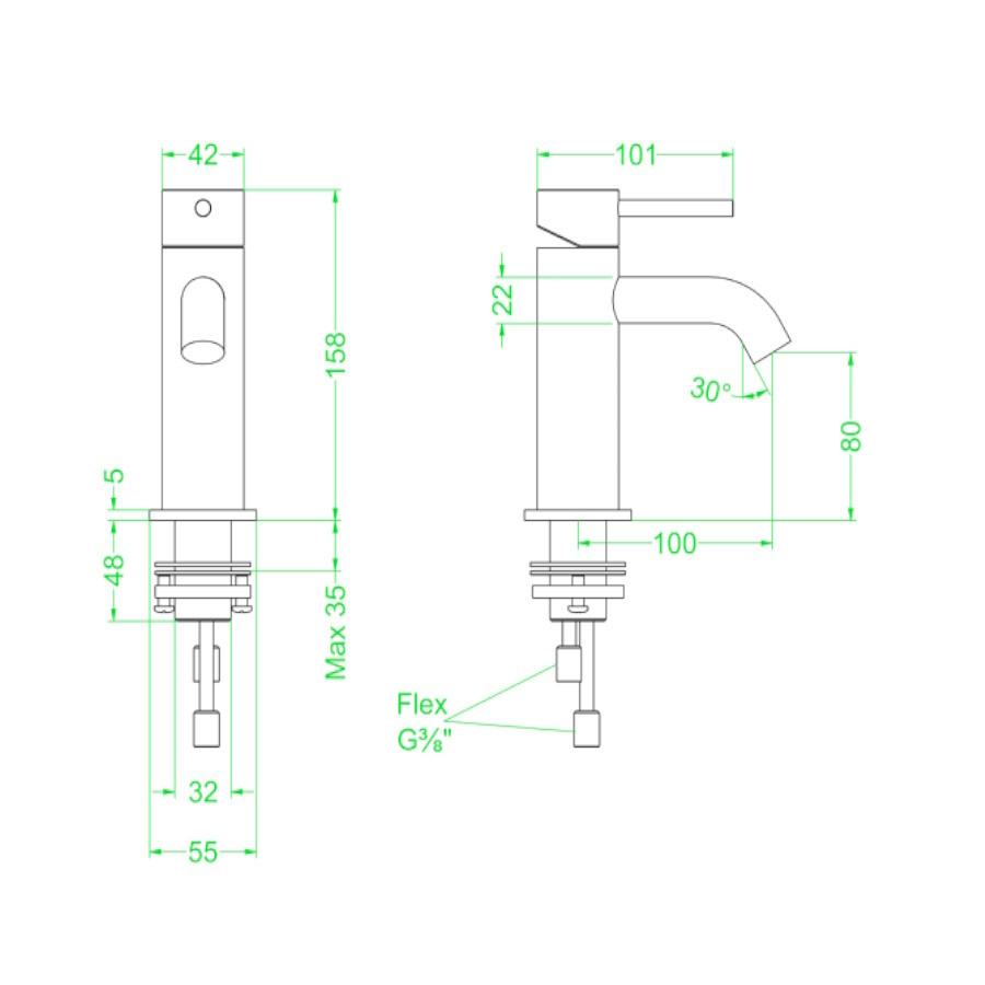 De wastafelkraan heeft een hoogte van 15,8 cm. Heeft een uitloop hoogte van 8 cm en een uitloop diepte van 10 cm. De kraan heeft een draadaansluitmaat van (inch) 3/8.