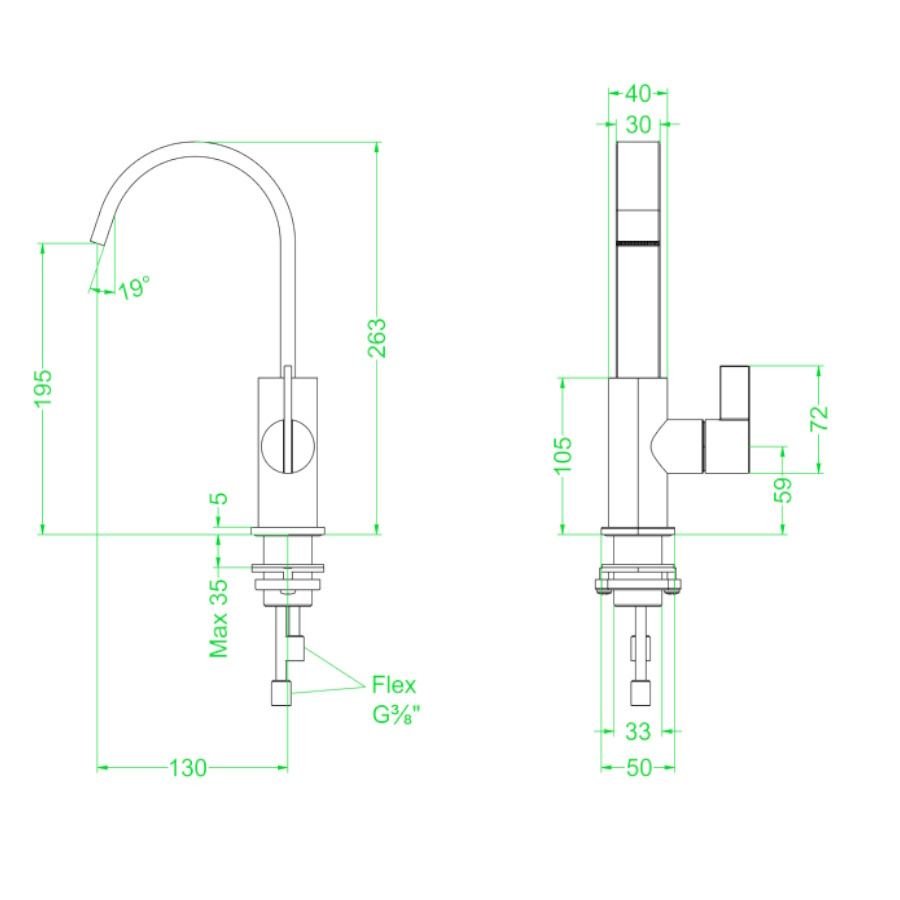 De wastafelkraan heeft een hoogte van 26,3 cm. De kraan heeft een uitloop hoogte van 19,5 cm en heeft een uitloop diepte 13 cm. De diameter is 3 cm en de maatdraadaansluiting is (inch) 3/8.