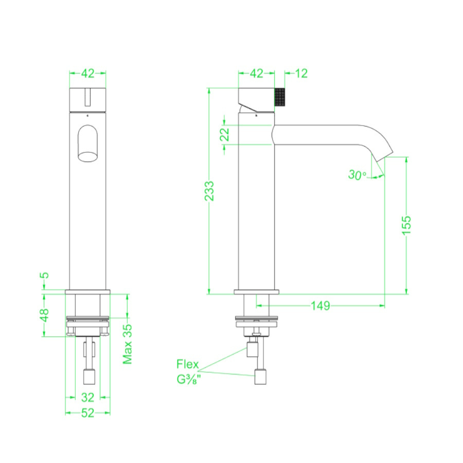 De wastafelkraan heeft een hoogte van 23,3 cm. Heeft een uitloop hoogte van 15,5 cm en een uitloop diepte van 14,9 cm. De kraan heeft een draadaansluitmaat van (inch) 3/8.