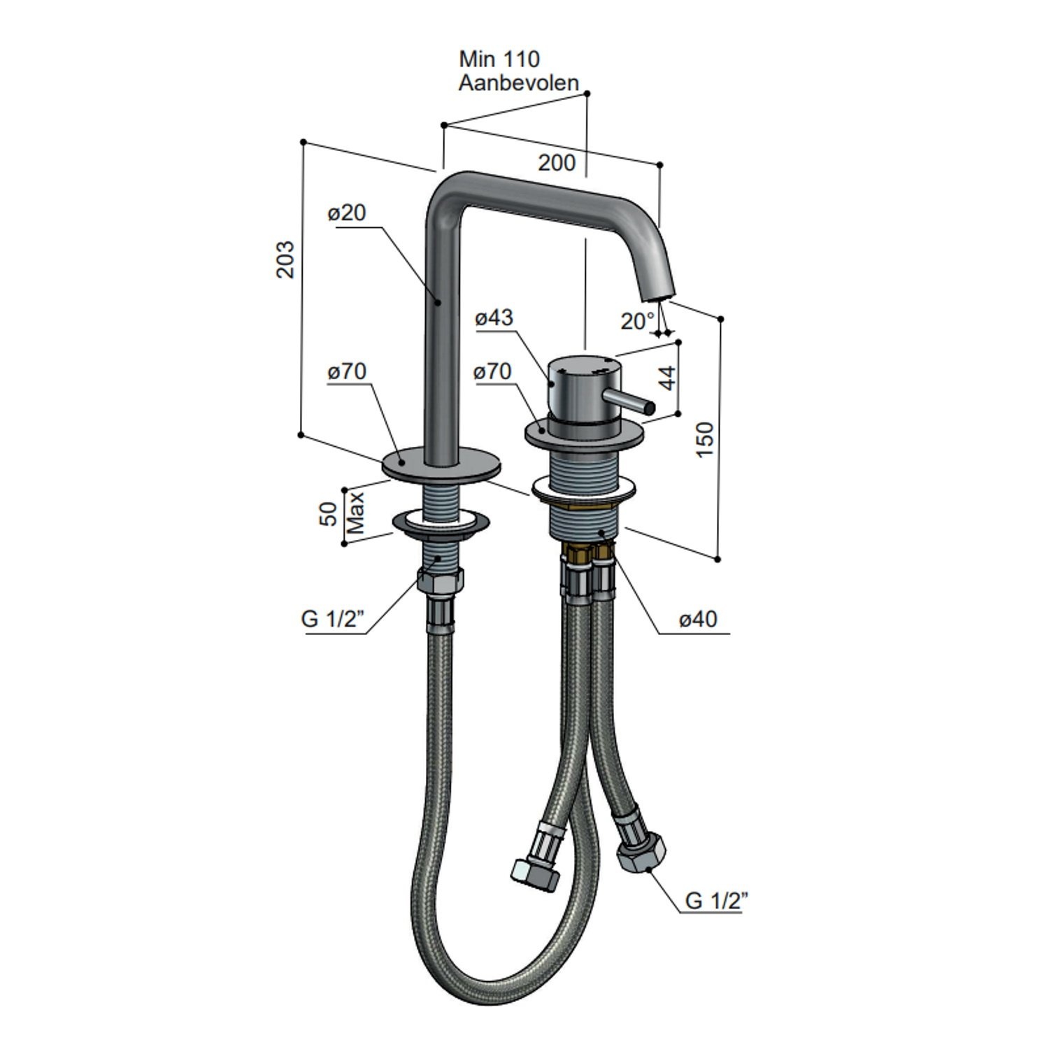 De kraan heeft rechte delen en ronde bochten waardoor het modern en stijlvol oogt. De diepte van de uitloop is 20 cm en de aanbevolen afstand tussen uitloop en hendel is 11 cm. Met een draadaansluiting van 1/2" heeft het een gangbare maat en past het vrijwel zeker ook in uw ruimte. Tot slot heeft u 10 jaar garantie dus gegarandeerd lang plezier.