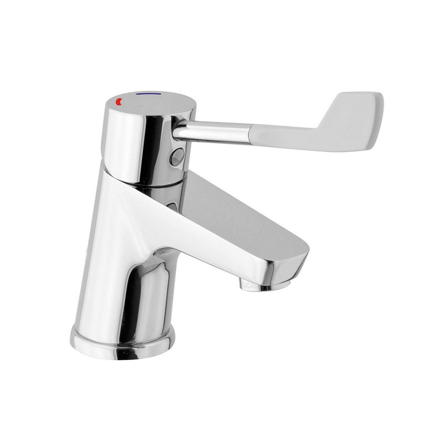De Lea wastafelmengkraan van het merk Sapho is speciaal geschikt voor lichamelijk gehandicapten. Door zijn extra lange hendel van zacht antislip materiaal is de kraan makkelijk te bedienen. De wastafelkraan is voorzien van een mengfunctie: dat houdt in dat u met de hendel warm en heet water kunt mengen tot de juiste temperatuur. U heeft geen 2 losse knoppen meer waar u mee moet stoeien om de juiste temperatuur te krijgen. De kraan heeft de hoogte van 15.4 cm. Ook heeft de kraan een keramisch binnenwerk, dit houdt de hendel jarenlang soepel in zijn beweging om water door te laten en de kraan goed te sluiten. De praktische kraan is afgewerkt in een chromen kleur.