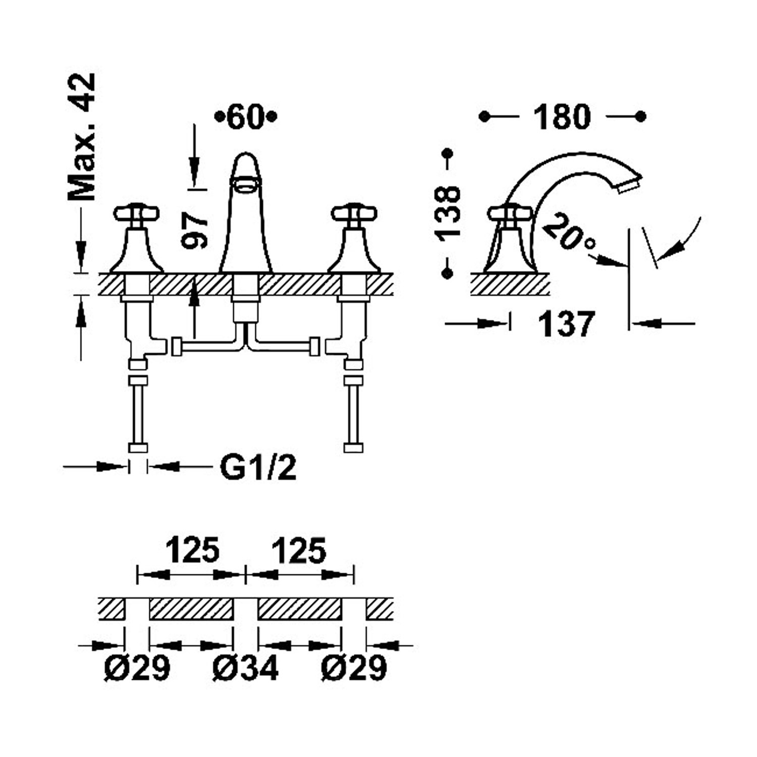 Om de kraan te kunnen aansluiten, is er een draadaansluiting van 1/2 inch. Daarnaast heeft het een kraangat met een diameter van 3.4 cm. De gaten van de grepen hebben een diameter van 2.9 cm.