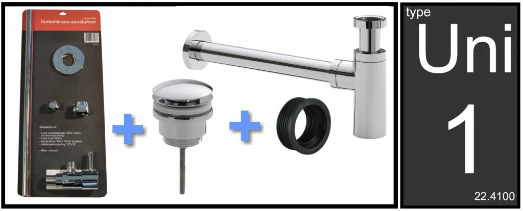 Aansluitset van het merk Aqua Splash en de serie Uni-1. Dit product is in de kleur Chroom. Deze aansluitset heeft alles wat u nodig heeft om een fontein/wastafel met een koudwaterkraan aan te sluiten.