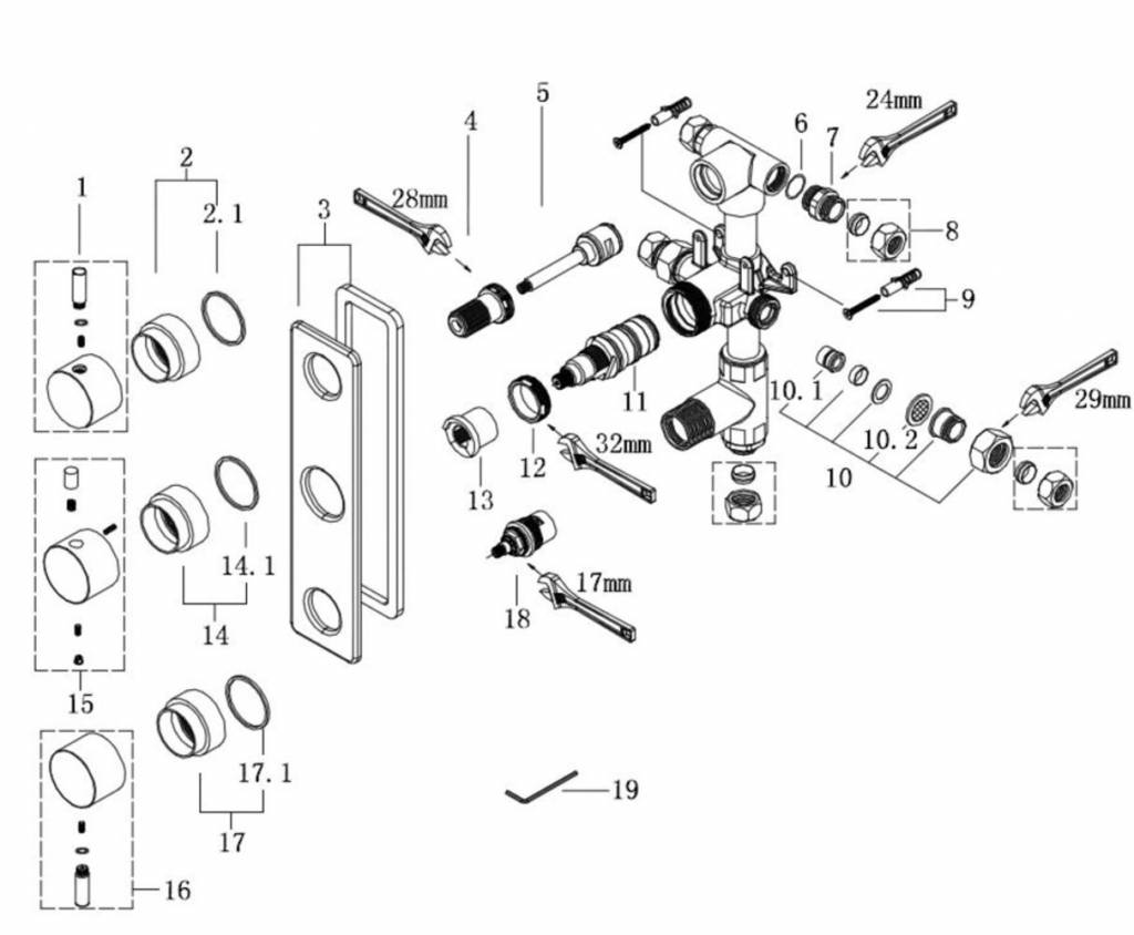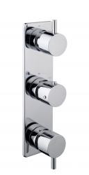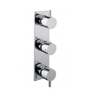 Caral inbouw 3-wegs douchethermostaat rond chroom, Inbouwdeel compleet met afbouwdeel chroom, 2xknel 15mm aansluiting, Bodemplaat 75x185, -de onderste knop is een aan/uit knop voor één uitgang, -de middelste knop is de thermostaatbediening met begrenzer o