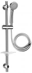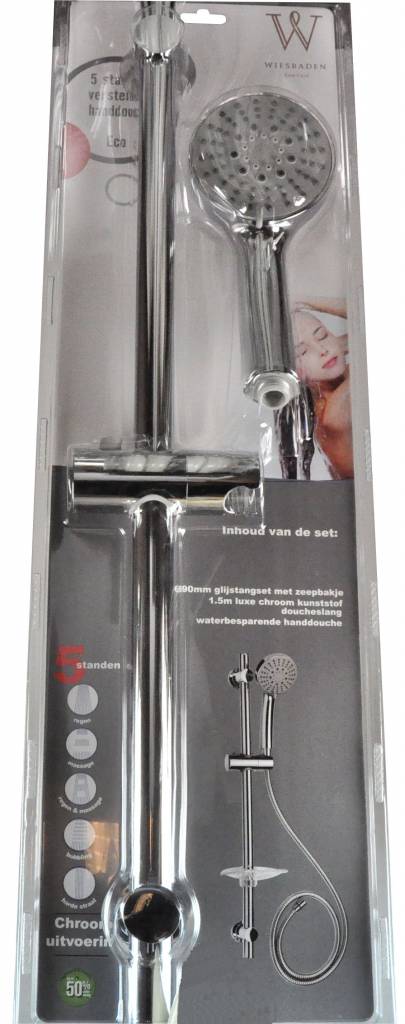 WiesBaden glijstangset, Chroom 5-standen handdouche met anti-kalk functie, 1.5m chroom kunststof luxe doucheslang, 690mm glijstang, 580mm hart-afstand schroefgaten, kunststof zeepschaaltje, optionele waterbesparende doorstroombegrenzer bespaart tot 50% wa