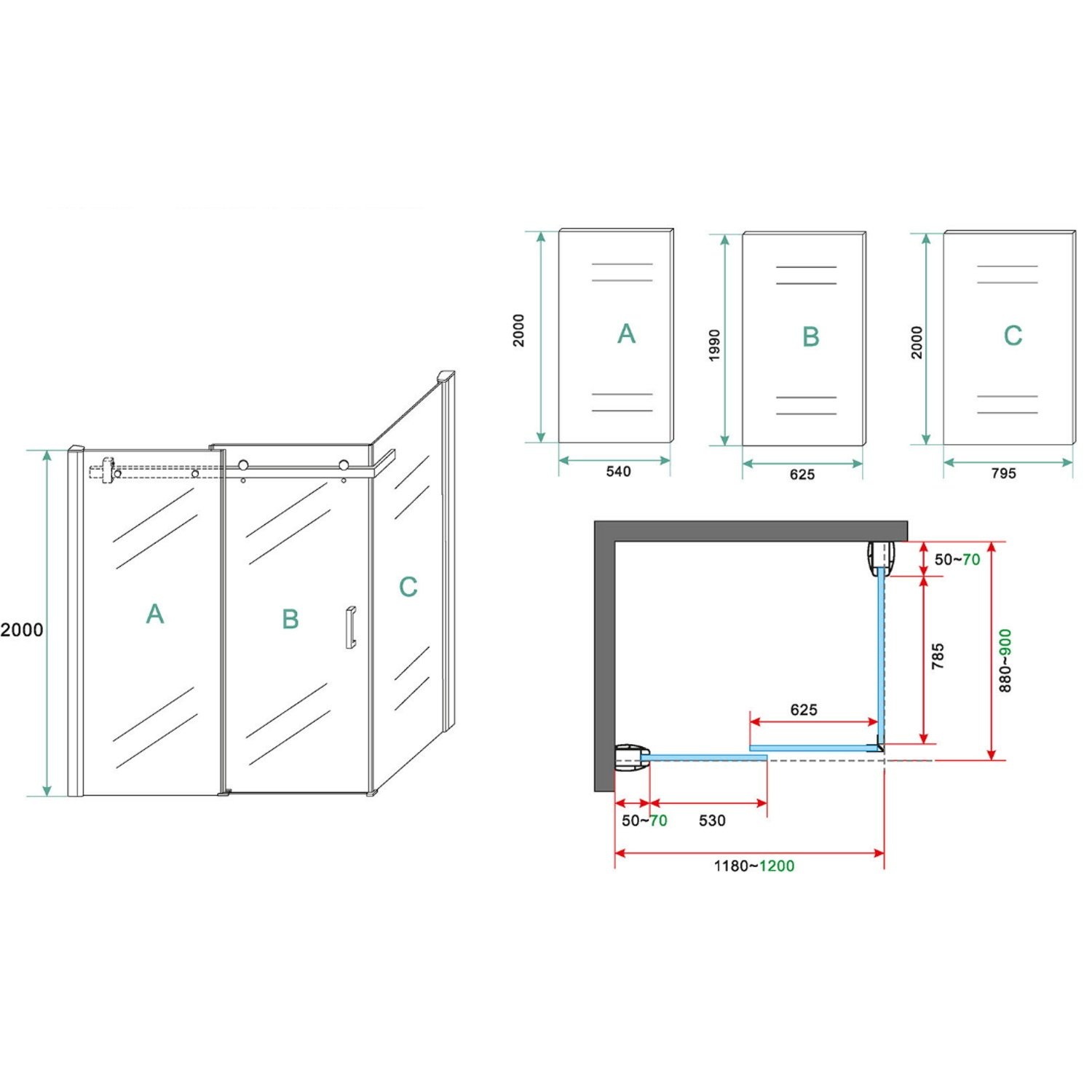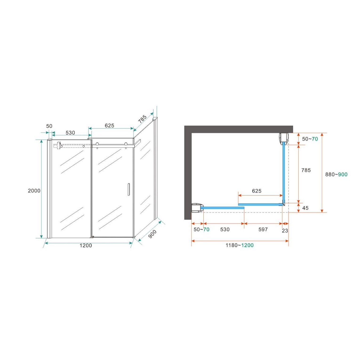 Deur 120cm, wand 90cm en 200cm hoog inclusief 2 chroom wand profielen welke 20mm aan beide zijden verstelbaar zijn.