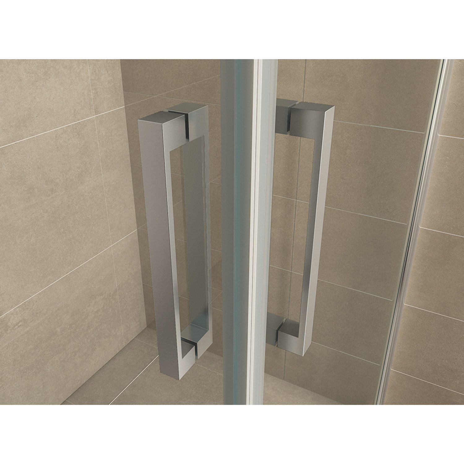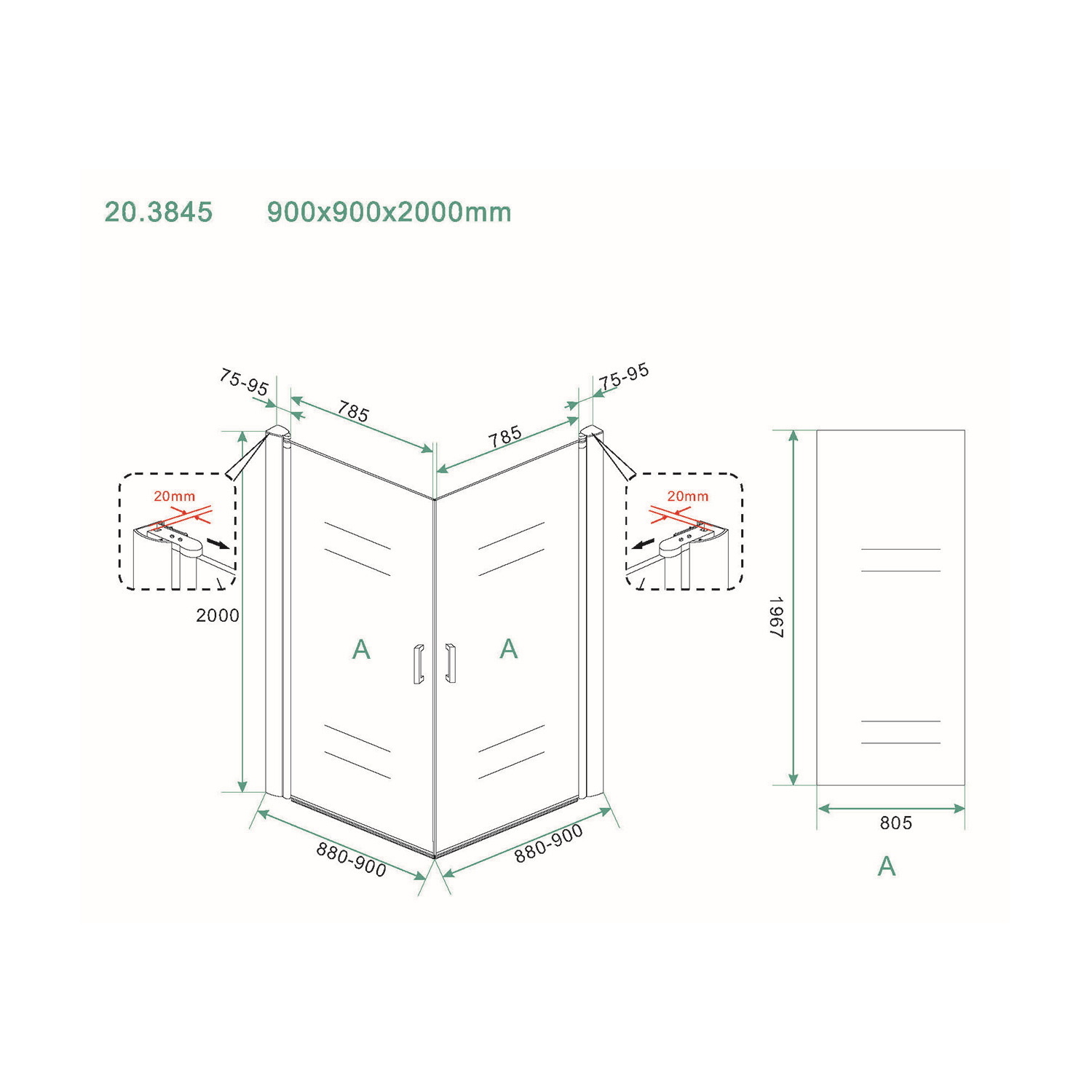 Zeer fraaie cabine bestaande uit 2xswingdeuren 90cm en 200cm hoog inclusief 2 chroom wand profielen welke 20mm aan beide zijden verstelbaar zijn. Glas 8mm dik met NANO Verstelbaar van 88 tot 90cm