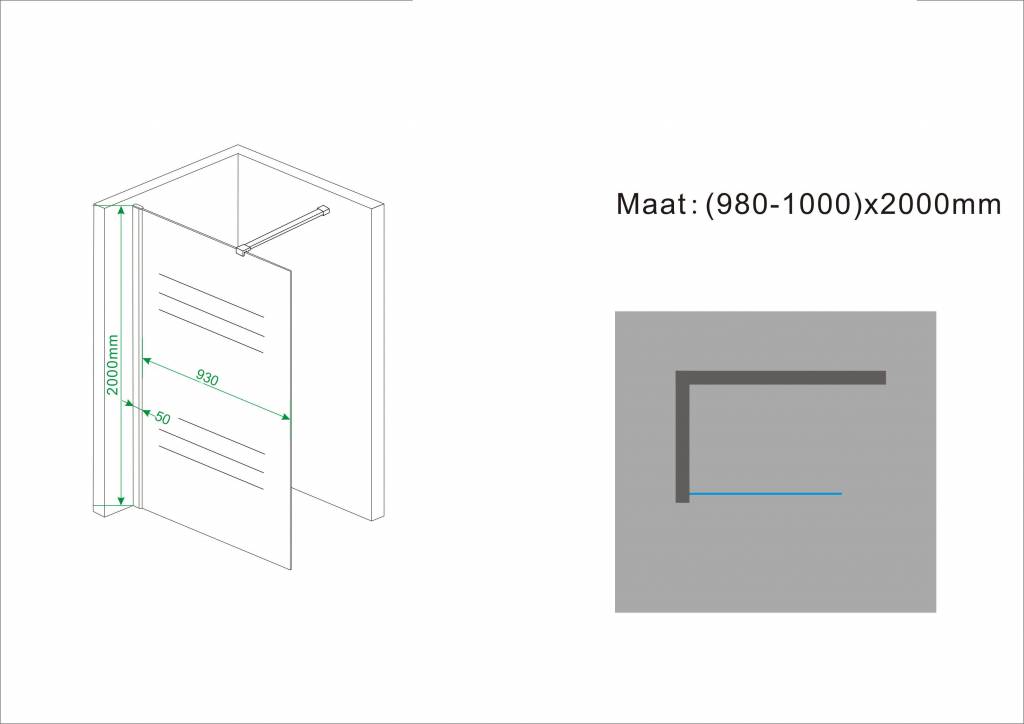 Zeer fraaie Inloopdouche 100cm breed 200cm hoog inclusief chroom zijprofiel en chroom stabilisatiestang van 100cm