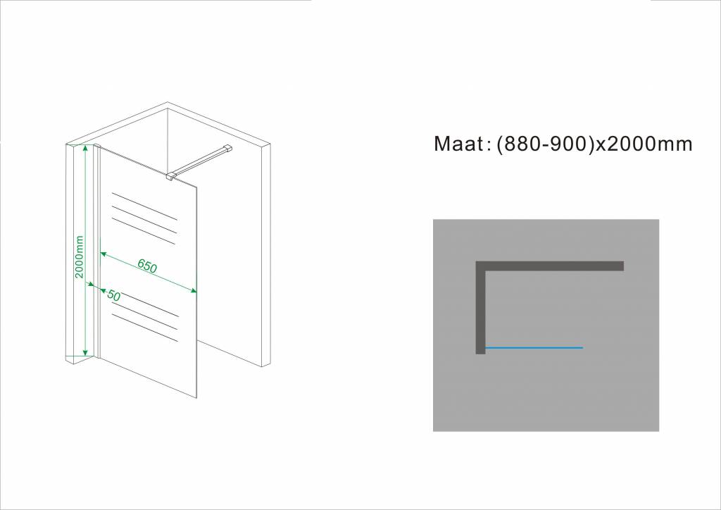 Zeer fraaie Inloopdouche 90cm breed 200cm hoog inclusief chroom zijprofiel en chroom stabilisatiestang van 100cm