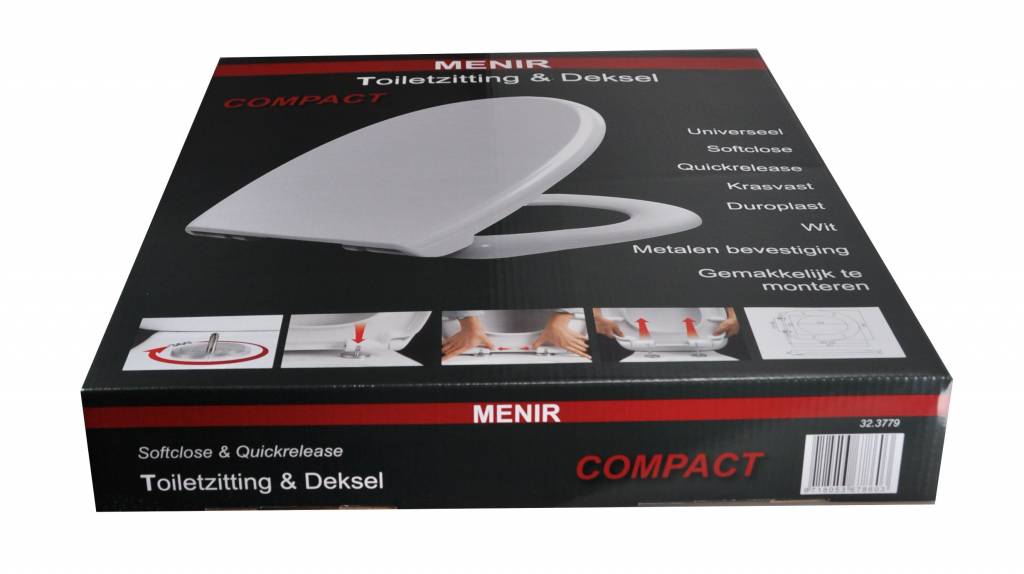 Toiletzitting+deksel wit. , Voorzien van Quick-Release bevestigingset en softclose functie. Verpakt in full-color doos met plastic handvat. , Materiaal Duroplast. Gewicht 2,2 kg.