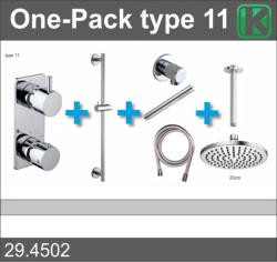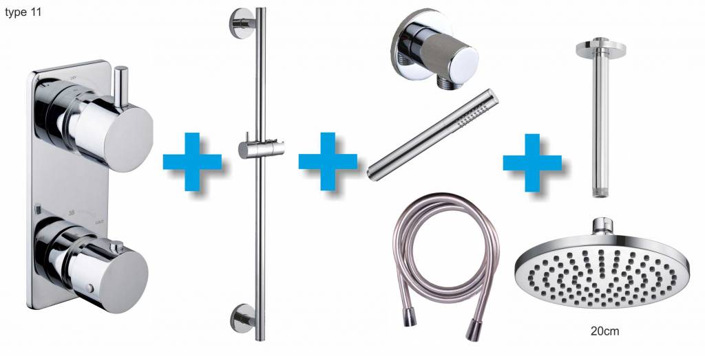 One-Pack inbouwthermostaatset type 11 (20cm), 1 29.3960 Caral 2 weg inbouwthermostaat, 1 29.3801 handdouchehouder, 1 29.3830 handdouche rond, 1 30.3530 doucheslang 150cm, 1 29.3840 chroom glijstang 65cm, 1 29.3815 hoofddouche 20cm, 1 29.3860 plafond arm,