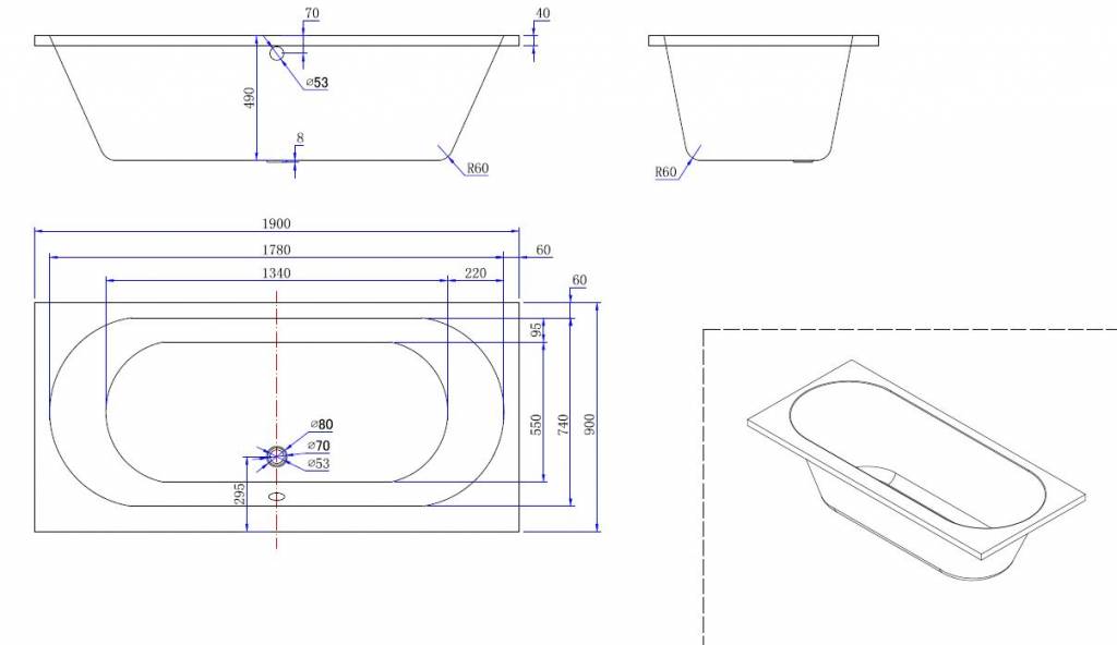 Portus RD inbouw ligbad, 190*90*49 cm, kleur wit, DUO-bad 3,5mm acryl, 2 lagen polyester,