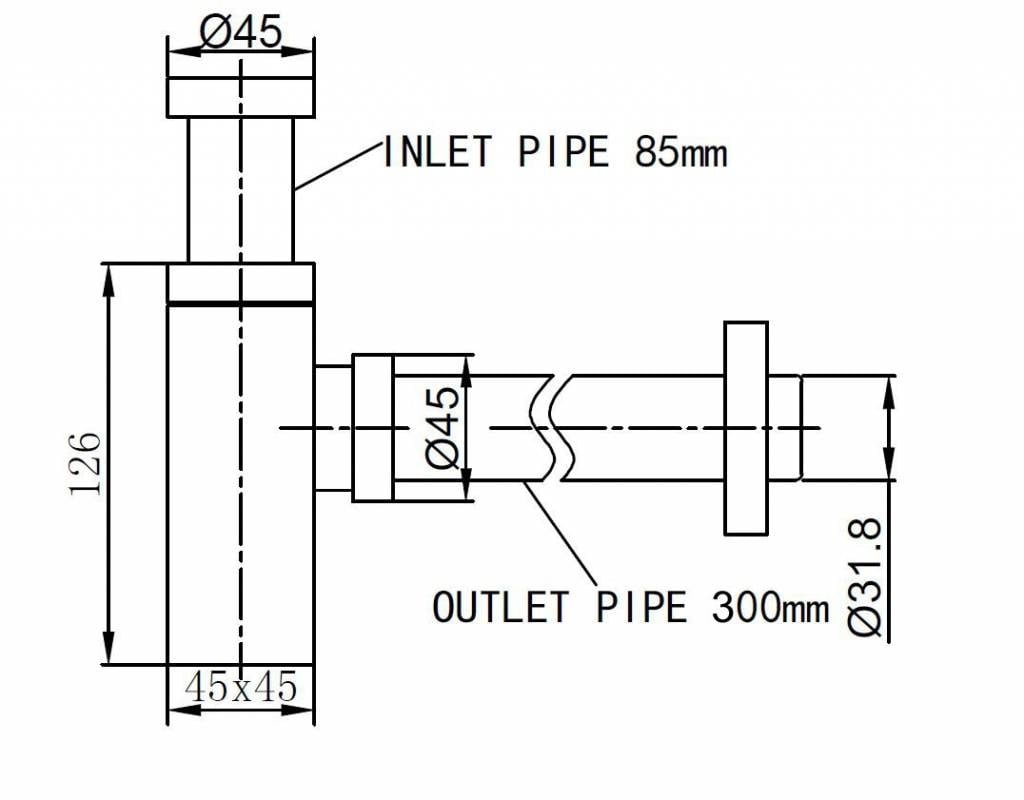 Star Luxe bekersifon vierkant, 11/4" x 32mm, messing verchroomd , inclusief muurbuis van 30cm en rozet ,