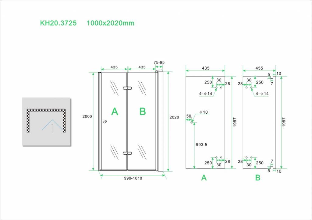 Wiesbaden vouwbare nisdeur 1000x2020 rechts 8mm NANO glas