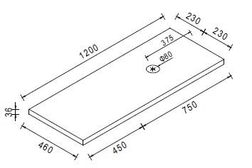 wastafelblad<br/> 1200 x 460 x 36<br/> voor 1 wastafel<br/> houtnerf grijs Dit blad combineren met een ladekast en een vierkante beugel<br/> wastafel zowel links als rechts te plaatsen<br/> Eventueel kraangat zelf aan te brengen<br/>