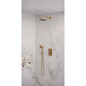 Regendoucheset Inbouw Brauer Gold Edition Thermostatisch 30cm met 3-Weg Omstelling, Gebogen Wandarm en 3-Standen Handdouche Geborsteld Goud